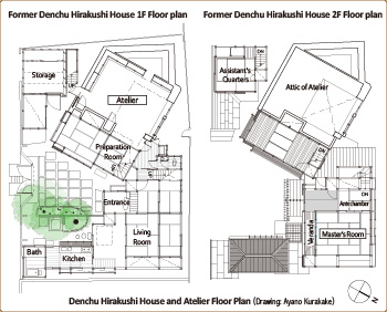 With the help of other artists and friends such as Taikan Yokoyama, Kanzan Shimomura, and Buzan Kimura, Denchu completed his atelier in 1919. It was a pioneering work of architecture, with a modern atelier and a north-facing skylight to capture the best natural light throughout the day. Three years later, he built a traditional Japanese house next to the atelier, where he and his family lived until 1970. He then donated the house and atelier to his hometown of Ibara City. The house is generally closed to the public, but is maintained by local non-profit groups and volunteers from Tokyo University of the Arts with the support of Ibara City to assist a new generation of artists, and is open for special exhibits.